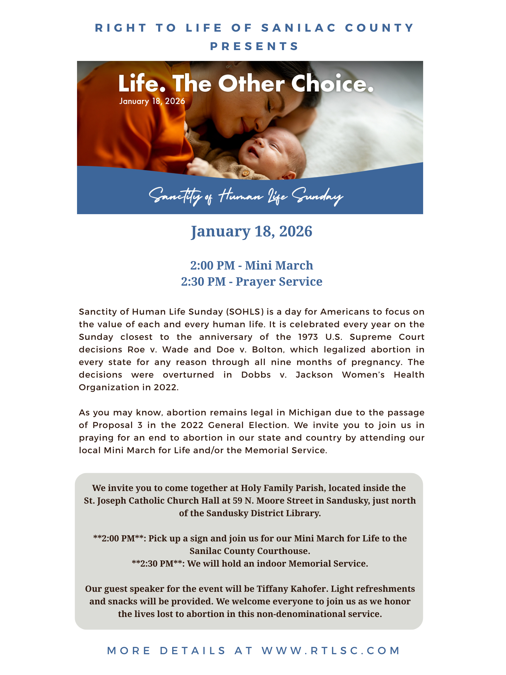 As you may know, abortion remains legal in Michigan due to the passage of Proposal 3 in the 2022 General Election. We invite you to join us in praying for an end to abortion in our state and country by attending our local Mini March for Life and/or the Memorial Service.