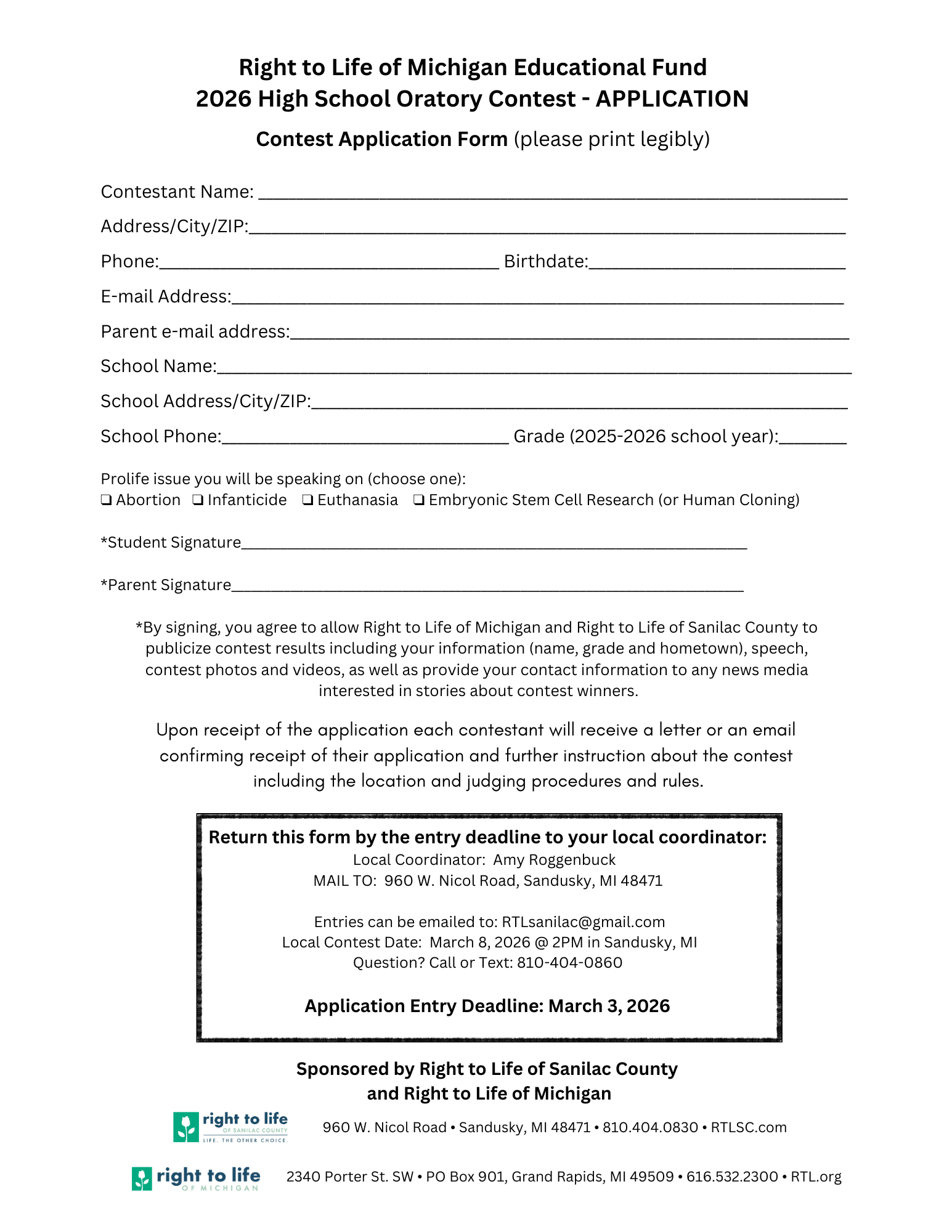 First place wins $400, second place wins $250 and third place receives $150. Our first place winner will be invited to give his/her speech at our annual benefit dinner on March 26th. The winner will also advance to the Right to Life of Michigan State Oratory Contest which will be held on April 18, 2026 in the Lansing area.